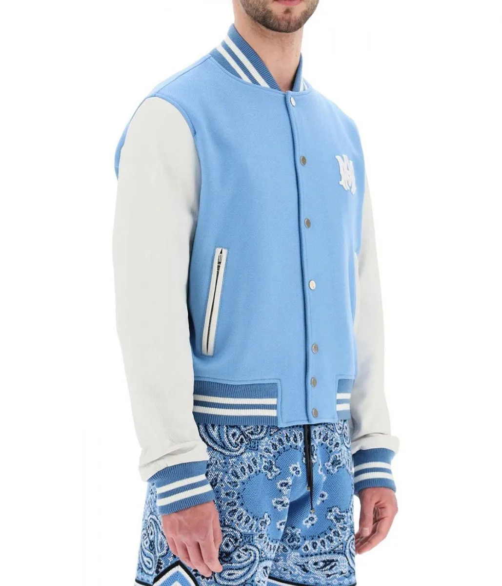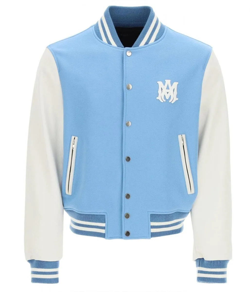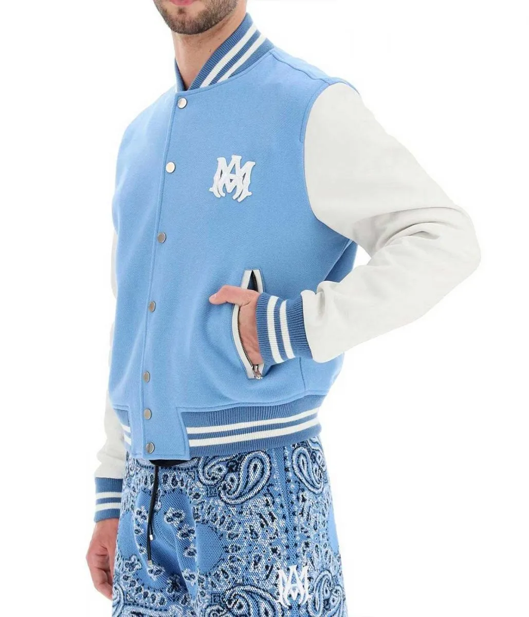This “Amiri Blue And White Letterman Jacket” is made up with the premium quality of 100% real wool material which gives this jacket a stunning look. Its mesmerizing light blue color with a combo of white colored sleeves, introduces an innovative and enchanted appearance that demands attention which you all definitely got from others. This “Amiri Letterman Jacket” promises to give you comfort and durability, making it the perfect choice for any party wear or sport wear.