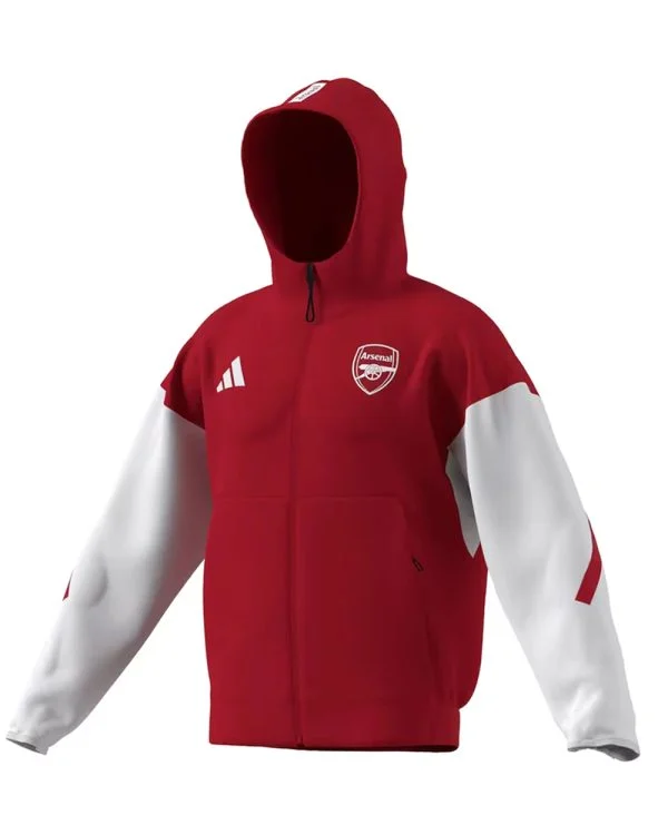 Show your loyalty to the gunner in style with the arsenal 2025-26 anthem red full zip jacket by addidas. Engineering for both fandom and function, this lightweight fleece jacket is tailored for mild weather, striking the perfect balance between the comfort and performance. Designed with modern athletic detailing. It features a hood that offers additional protection from the elements. This red jacket is ideal for supporters of Adidas. And ideal for outdoor activities like casual wear and get together.Â