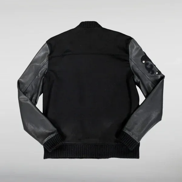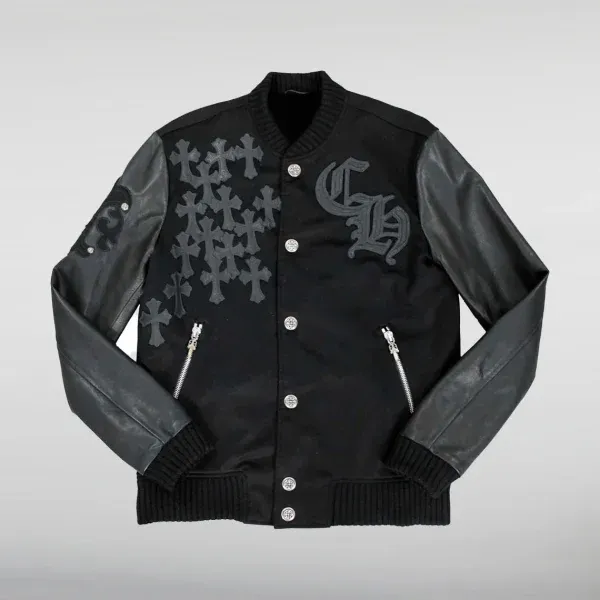 This “Chrome Hearts Varsity Jacket” is crafted with a real wool material with interior soft viscose lining. Its front has button up closure and has rib-knitted style collar. It is crafted with full length sleeves with leather material and has rib-knitted cuffs and hemline. It comes in a sleek black color with two side zipper pockets. Available in various sizes only in Ralph Outfits who gives you fine stitched attires with durability.