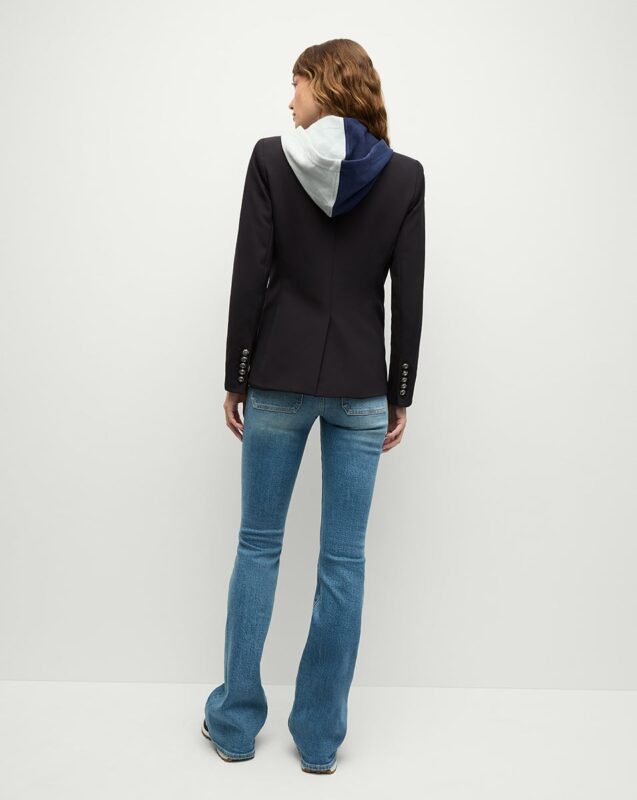 You can style this with both ways, like buttoning up the blazer or zipping up the inner hooded material, as it has suitable fabric material with soft lining. You can style this in both ways and get the comfort and coziness. From the outside it has a lapel collar and on the inside it has a hooded collar. The blazer has black color with star print on the left chest of it. The inner has a blue and grey collar combo with zipper closure.