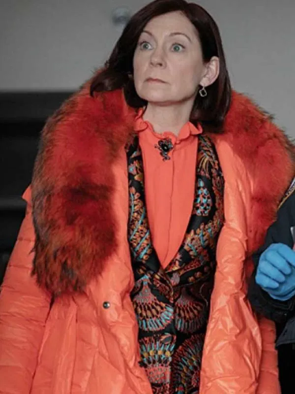 Elsbeth Tascioni Series Elsbeth 2024 Carrie Preston Orange Puffer Coat with Faux Fur