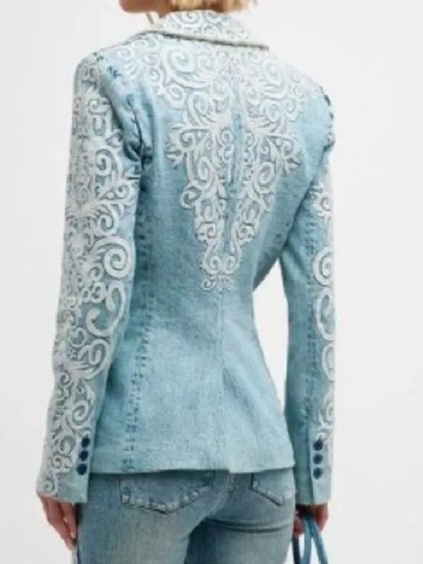 The “Found S2 Shanola Hampton Embroidered Denim Blazer” is crafted from high-quality denim fabric. It characteristics an impressive outer design that includes a button front closure, a lapel collar, extended sleeves, and round cuffs. This captivating garment is offered in a blend of Blue and White color contrast. This stunning fit will enhance your beauty.