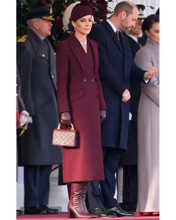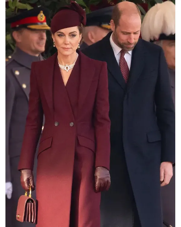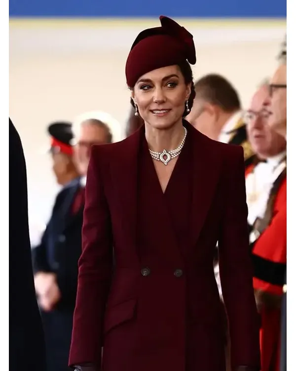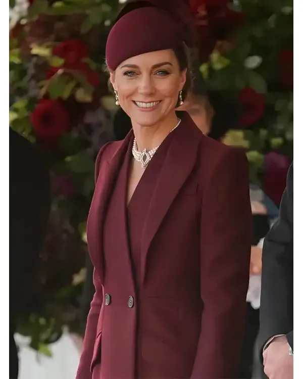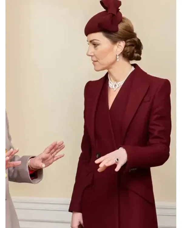 Elegance meets timeless british tailorino with the kate middleton alexander mc queen long burgundy coat a regal outwear fit piece inspired by the princess of Wales’ iconic style. Worn by Kate during official royal engagement this coat embodies sophistication, refinement and impeccable craftsmanship of alexander mcqueen.