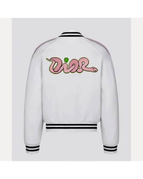 This amazing jacket is in white color with black design on its sleeves and collar and also it has a snake patch design in the front left chest and back of the jacket in pink color. This jacket is not just a piece of clothing, it is a fashionable statement to be admired by anyone. It is made up of wool material but the sleeves have leather material with a long length. It has zipper closure and can be styled with an inner shirt. This jacket has rib-knitted cuffs and collar with two side waist pockets.