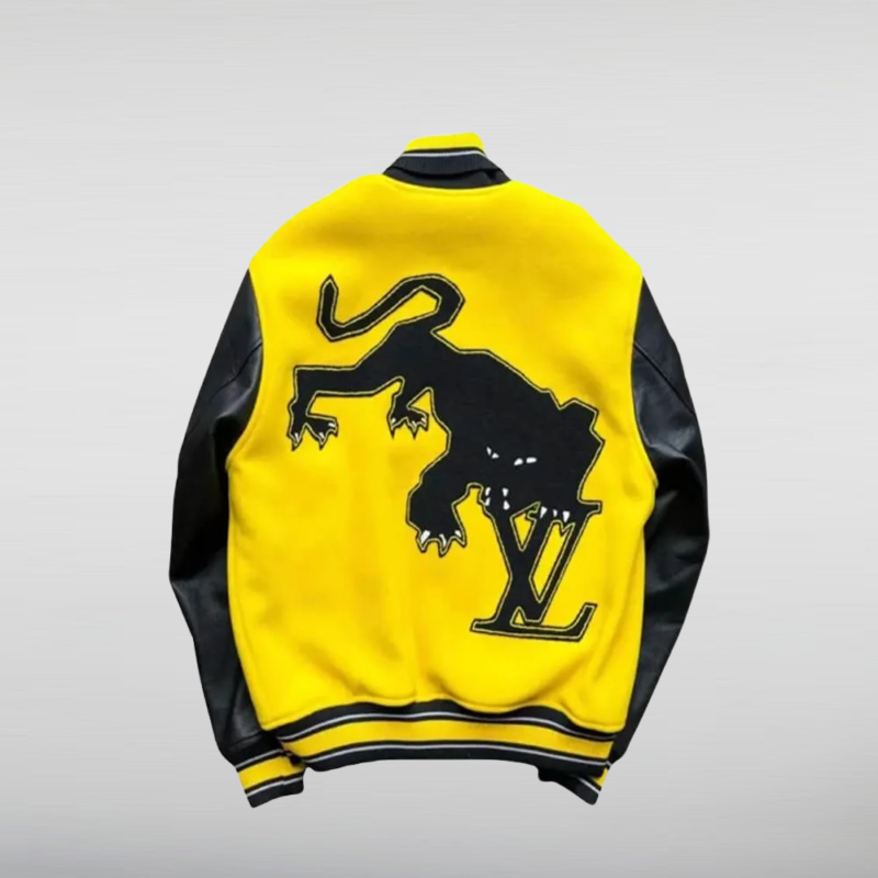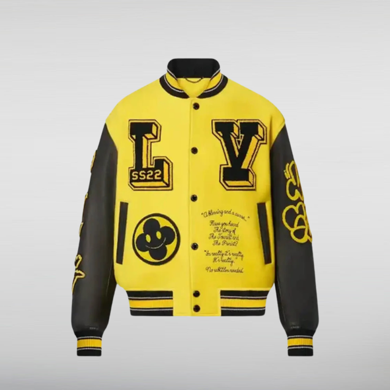 Louis Vuitton varsity jacket redefines timeless with the luxurious best detailing inspired by classic collegiate style. Crafted from wool material, front snap-tab button closure, internal soft viscose lining, rib knitted collar, rib knitted cuffs, full length sleeves, two inside and two outside pockets and available in yellow color sizes are available in xs to xxxl.