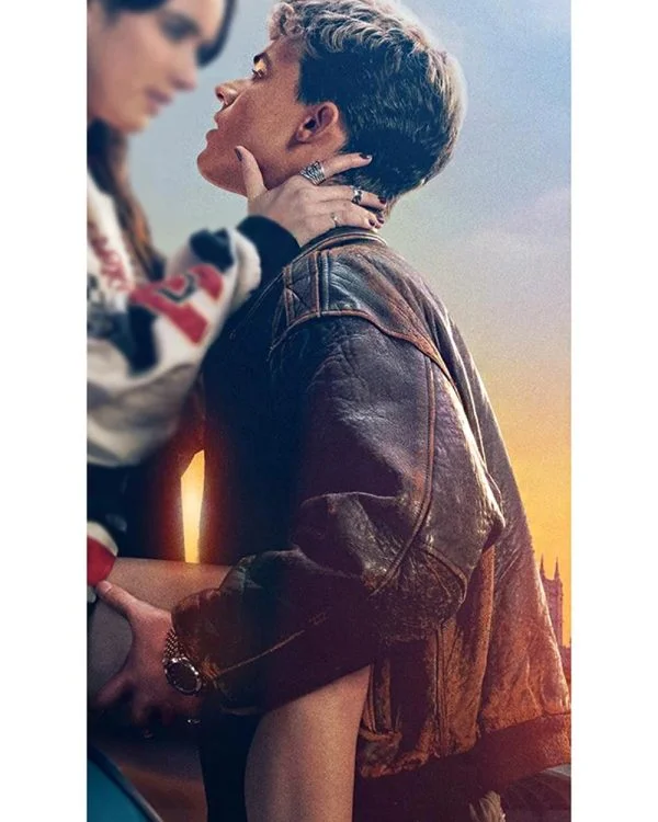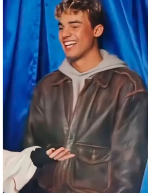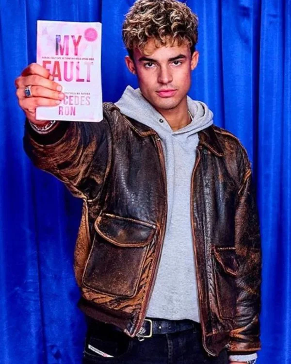Nick Film My Fault London 2025 Matthew Broome Brown Distressed Leather Jacket