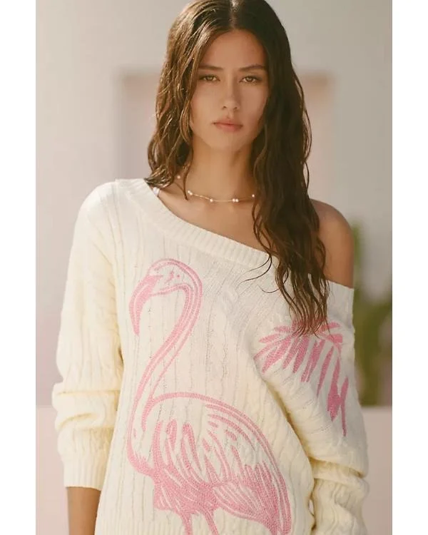 Pink Flamingo Printed Boat-Neck Cable Knit Sweater