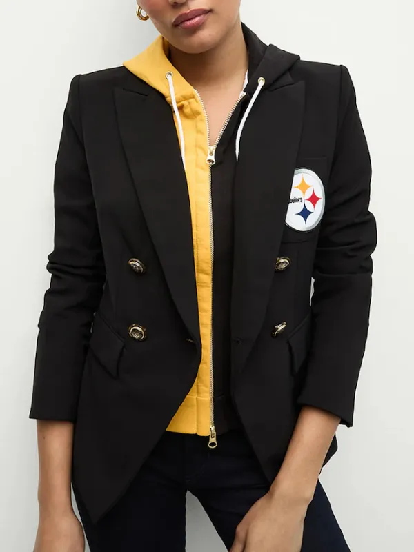 Brag your team spirit in exciting style with the Pittsburgh Steeler Veronica Beard Black Dickey Jacket. This masterpiece combine classic sophistication with sporty pride, featuring smooth black fabric, subtle Steelers, and a sharp silhouette detailing that adds just the right amount of edge. This jacket designed by the Veronica Beard, this blazer is perfect for the day of game or any day you want to represent your team in a fashion-forward, polish way. This jacket gives versatility to your wardrobe. It’s a must-have piece of ours.