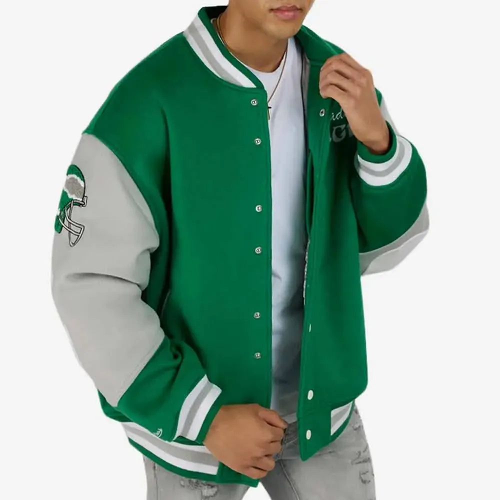 This stunning jacket has 100% real wool material with quilted viscose lining that will go perfectly in the winter season. You can wear this jacket anywhere you want, it has the Philadelphia Eagles logo on the front and back of it and some other logos on the sleeves of it. It offers a buttoned up closure and full length sleeves with rib-knitted cuffs and rib-knitted collar. How can we forget about the pockets? It has two side waist pockets for storage.