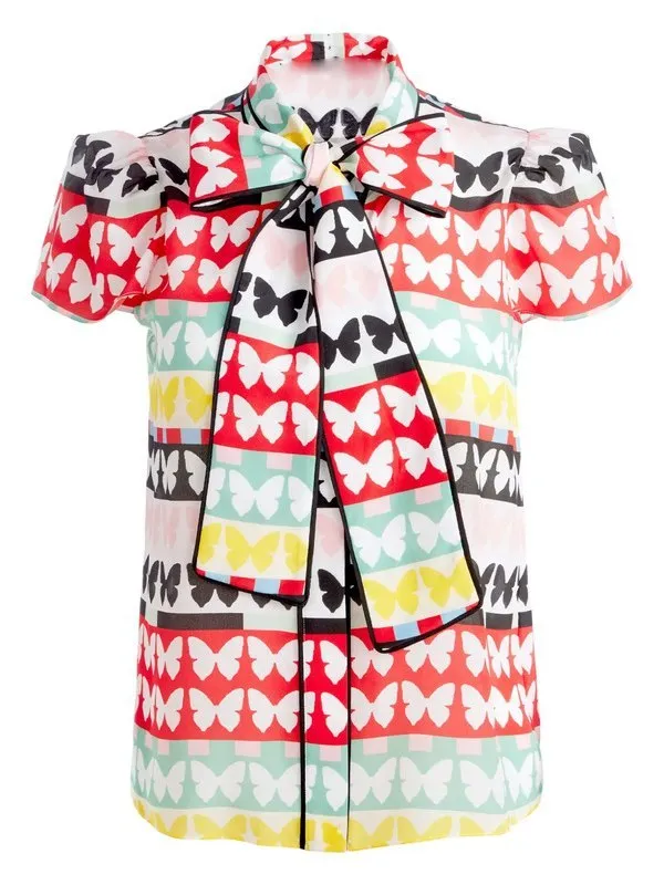 The View 2025 Alyssa Farah Griffin Butterfly Print Silk Tie Neck Top